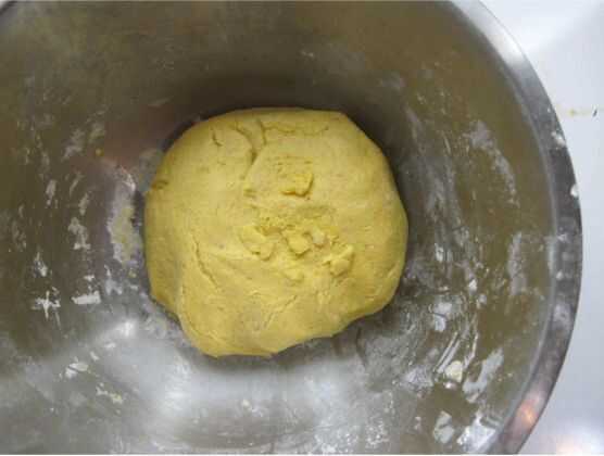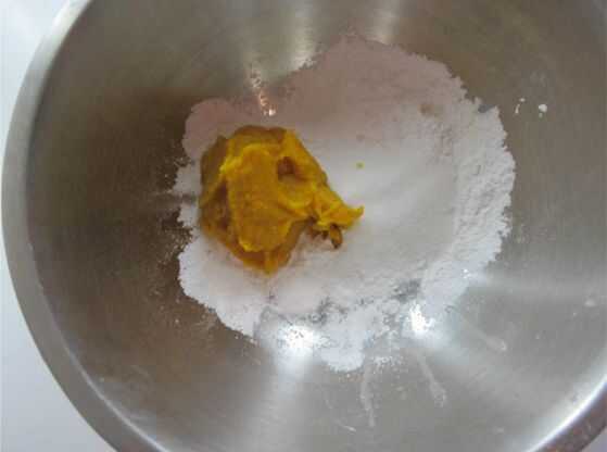 Poner el puré de calabaza, azúcar y harina de arroz glutinoso, mezclan a una pasta. Si su puré contiene demasiada agua, añadir más harina hasta que no quede pegajoso en la mano.