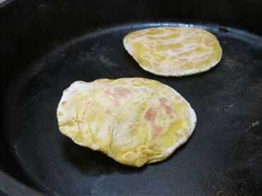 Rocíe el sartén con aceite. Calentar con fuego medio y poner la masa en la sartén, darle la vuelta cuando un lado esté dorado.