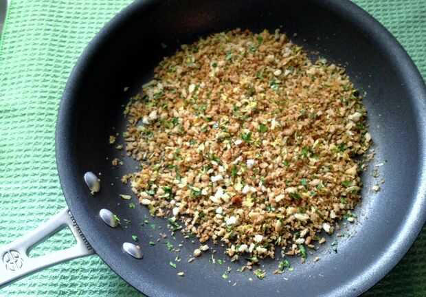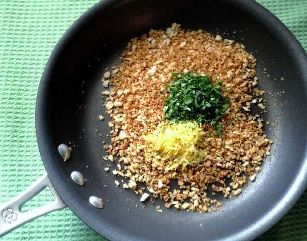 Derretir 1 cucharada sin sal de mantequilla en una sartén mediana a fuego medio-bajo. Añadir panko y pizca de sal y pan tostado, revolviendo frecuentemente, hasta oro marrón, 5-8 minutos. Retirar del fuego, añadir la ralladura de limón y perejil y revuelva para combinar. Transferir a un bol pequeño y reservar.