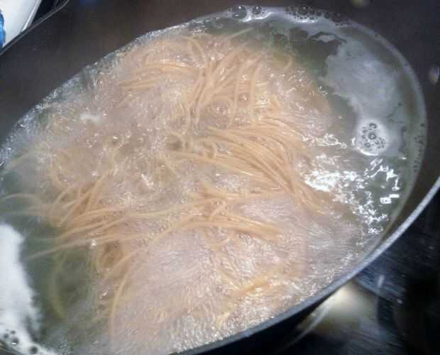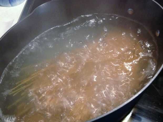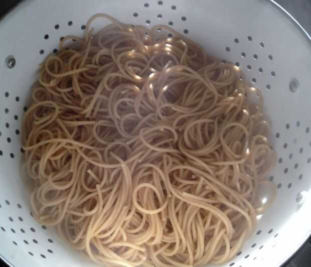 Esto es muy importante, antes de drenar, reservar 2/3 de taza del agua de la pasta de almidón. Escurrir la pasta.