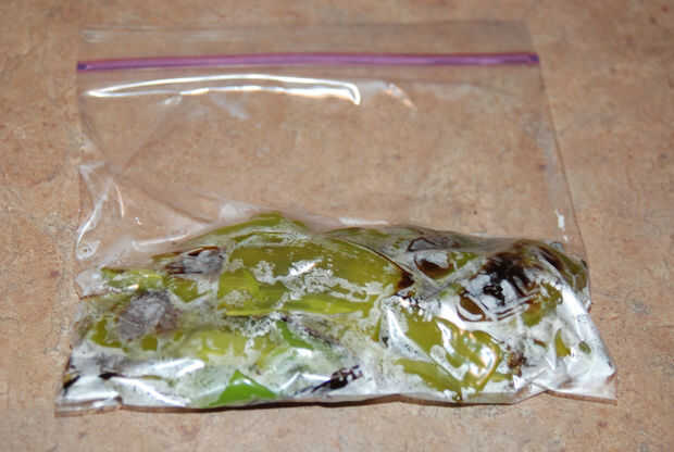 Cuando son sacados del horno, luego colocar en su bolsa hermética preferido para la congelación. Me gusta usar el papel como un embudo para que no te los aceites de los chiles en mis manos (tocar tus cara/nariz/ojos después de manejar chiles no es una divertida experiencia... como ya he mencionado antes).