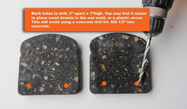 Día 3:04 puede pulir la parte superior del concreto si lo desea. Usamos tampones para pulir del diamante, pero también funciona 60 arena y papel de lija de grano 120. Taladros (alternativamente podría depositada una paja de plástico relleno con espuma de poliestireno, pasador de madera, u otro enchufe 1/2 profundidad en el cemento húmedo) del mismo diámetro que el taco de madera y metal/plástico. Como una guía hecha una plantilla de madera y colocar sobre el área para perforar para asegurar la colocación adecuada de los agujeros y la profundidad.