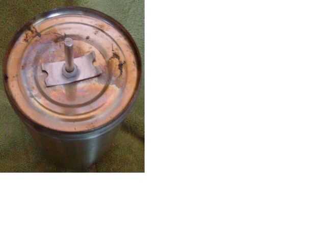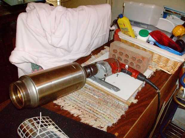 Quité el plástico inferior con mi pistola de calor para ablandar el pegamento. Sobre todo lo hice para el termo era taladro un agujero en el centro de la parte inferior lo suficientemente grande para que quepa un perno de 1/4 "x 20. El perno fue 4" de largo pero el área roscada es sólo 1" de largo. Corrí una tuerca abajo los hilos luego una arandela. A continuación pongo el tornillo en el extremo del termo. Luego le puse una arandela y una tuerca en el extremo del perno. Utilicé un zócalo, extensión, o varios cortos más, trinquete y un par de alicates de apriete para arriba. También suelo la cabeza del perno para chuck mejor.