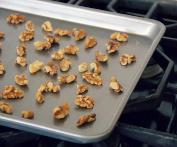 Una vez listo el horno, tomar 1/2 taza de nueces crudas y difunde hacia fuera en una placa para horno (sin tuerca de apilamiento) y ponerlos en el horno en el estante medio.