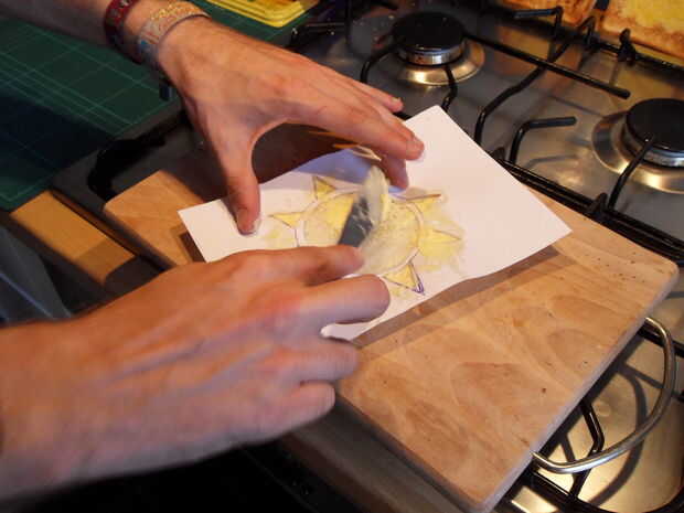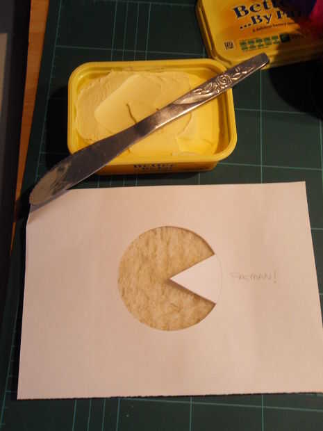 Extender la margarina hacia dentro, a partir en el papel y movimiento sobre el pan para que usted obtenga como sostenido una línea de marge como sea posible. Separarse en la dirección opuesta le dará una línea blury.