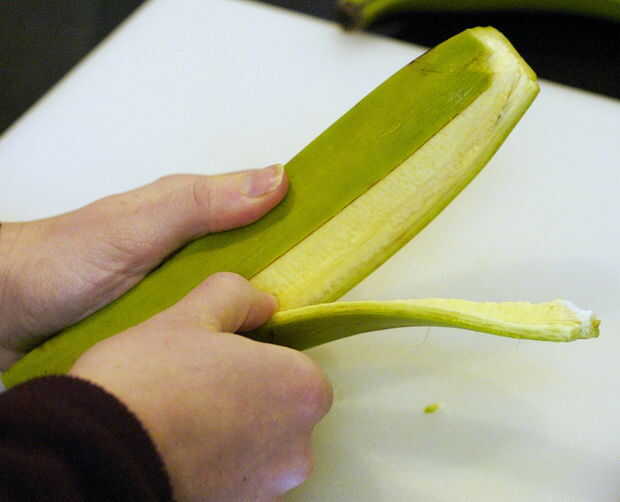 Una vez que baje la primera tira, el resto de la piel será más fácil de manejar. Pelar y cortar el resto de la piel apagado, dejando el almidón plátano.