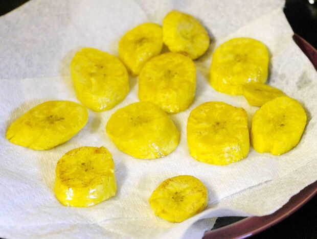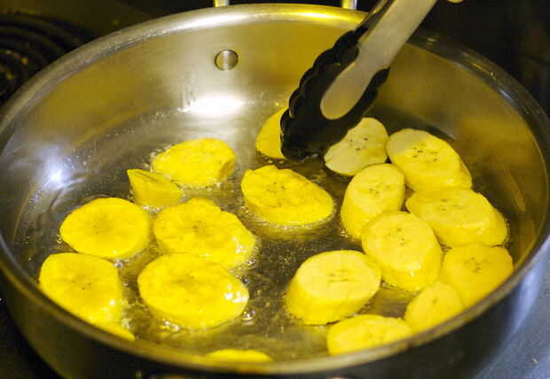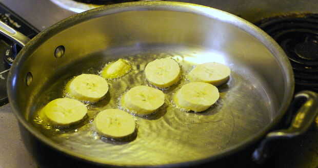 Calentar el aceite de canola en una sartén de fondo pesado hasta que brilla. Añadir los plátanos uno por uno; Si Arden, el aceite está suficientemente caliente. Agitar la olla un poco a mantener los plátanos en movimiento; si flotan libremente en el aceite. Si se pegan, es probable que no estaba suficientemente caliente.