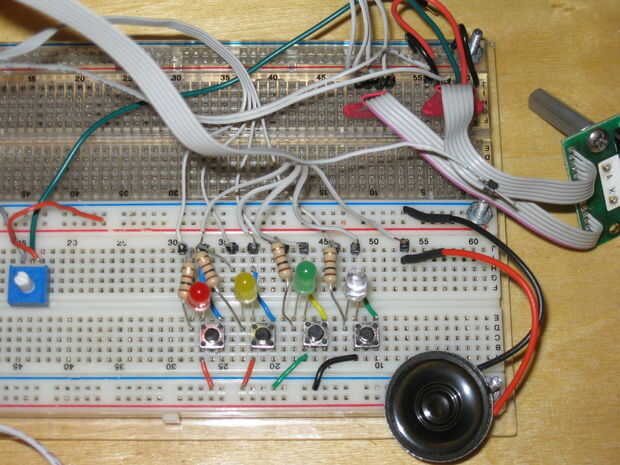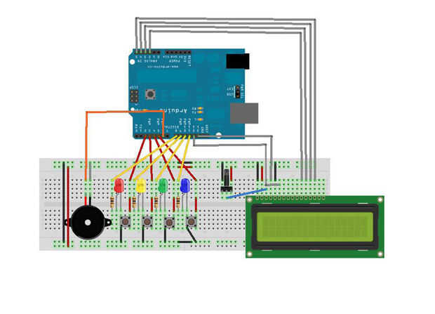 Usted puede devolver a la Arduino Simon dice Instructable sobre la configuración del resto del hardware. El único cambio que hizo fue mover el altavoz sobre al pin 6. Espero que la imagen de Fritzing ayuda a aclarar cualquier confusión que podría haber en el cableado. Fui por delante y adjunta el archivo Fritzing si necesita una mejor imagen en el diagrama. Usted puede también devolver a mi costumbre fuente grande de 16 x 2 LCD para obtener más información sobre cómo configurar un HD44780 de Hitachi base de 16 x 2 LCD en el Arduino.