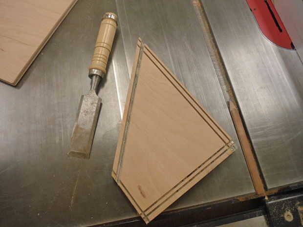 Utilizando un pequeño pedazo de chatarra hicieron algunos cortes de prueba a la parte inferior del surco alto colocado suficiente generalmente igual al espesor de madera contrachapada de fondo. A continuación hice cortes progresivos a hurtadillas a la anchura correcta para la parte inferior. Esta ranura debe ser tan profunda como el grosor, por lo que he hecho 1/4 pulgada de profundidad. El ajuste debe ser un ajuste deslizante para auxilios en Asamblea y más tarde, en caso de humedad hace que la madera expandir y mover que lo permitiría.