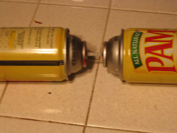 Tire suavemente de las puntas en las latas de llenos y vacías. Corte una sección corta de la tubería que previamente cortado fuera de la lata vacía. Ponerlo sobre las boquillas salientes (sin las puntas). Puede ayudar el usar un encendedor para obtener un ajuste más apretado en ella. Asegurarse de que todo el puede es lado derecho y ambas latas están conectados al tubo, abra las válvulas empujando hacia abajo sobre ambas boquillas simultáneamente. Si usted hizo un buen sello en el paso 6, puede debe empezar a rellenar. (Tenga en cuenta que no llenarla demasiado porque sería malo poner demasiada presión sobre la Junta.) Sin embargo, si la botella no estaba bien sellado lo puede experimentar una pérdida. Trate de añadir otra capa gruesa de pegamento y repetir este paso una vez la nueva capa está seca.