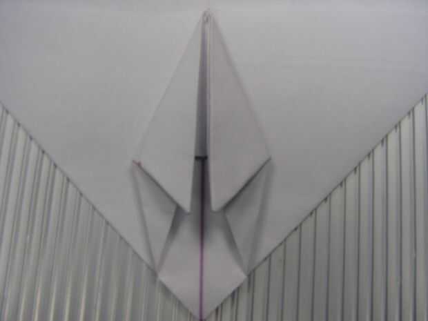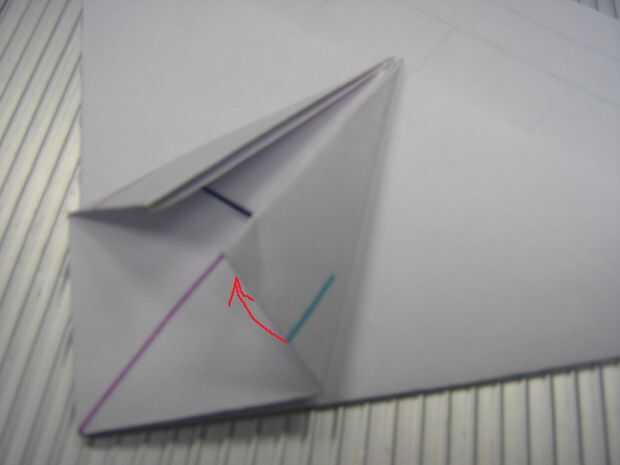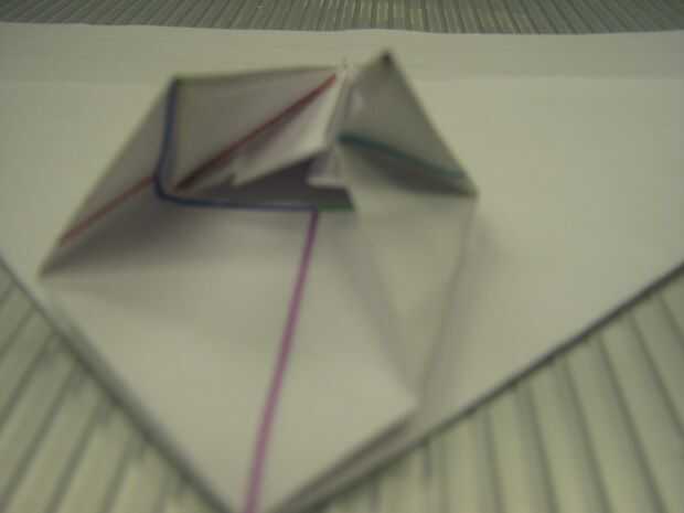 Básicamente vas a meter la parte inferior del triángulo de mano derecha por debajo de sí mismo, para que el doblez interno está en la línea azul. Ahora las líneas de color rosas y azules podrían no alinear perfectamente con su doble, como depende de lo perfecto tus preciosos pliegues fueron (o sólo podrían ser un poco apagado).
