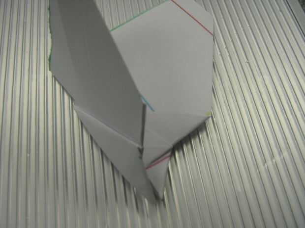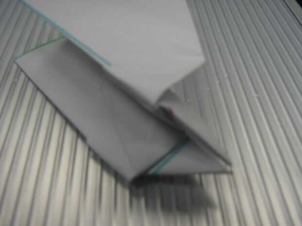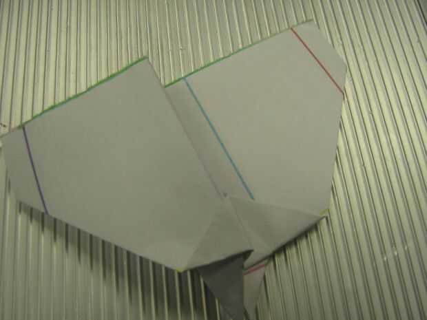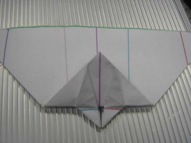 Abrir el documento de modo que pueden manipular ambos lados. Ahora tomar ambos lados y doblar para que el frente del ala (frente a todos los pliegues) es ligeramente superior a la parte posterior del ala o doble a lo largo de la línea azul o luz de ping. Repita para la otra ala.