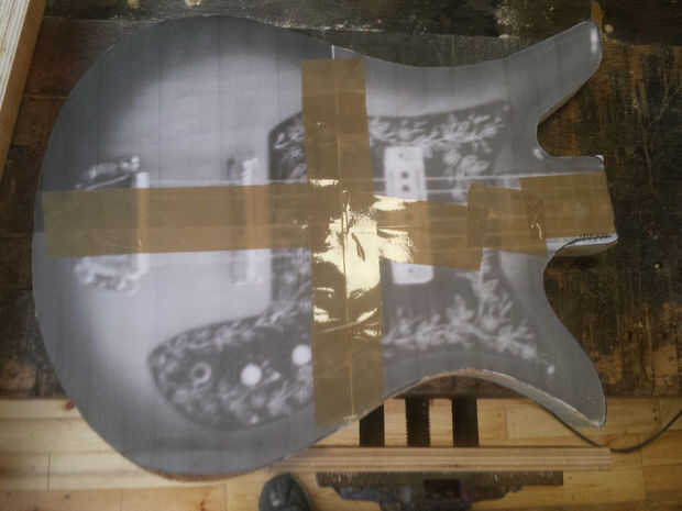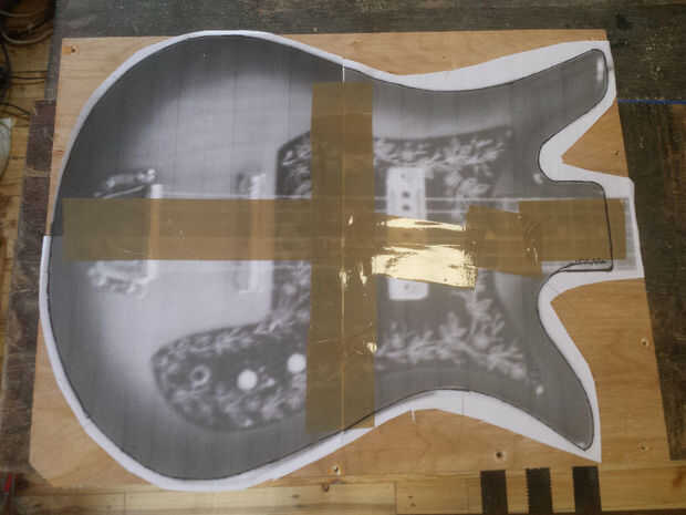 Usted necesita algo para cortar alrededor de. Hice una impresión de escala de una guitarra que quería copiar pero usted podría dibujar a mano alzada, o una combinación, uso una impresión pero modificarlo. Resalté el contorno como lo era borrosa.