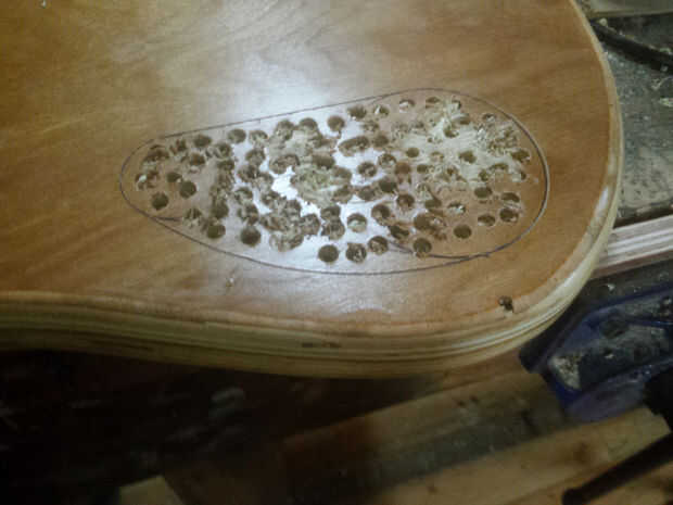 Con las cavidades recolección marcadas hacia fuera, utilice un taladro con un marcador de profundidad para eliminar la mayor parte de la madera a una profundidad más allá de la profundidad de pickups. Esto no es esencial pero facilita.