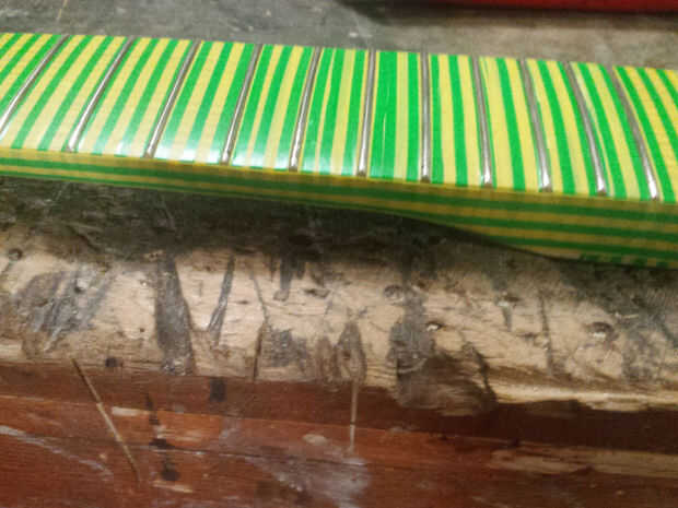un stand de guitarra hecho de pedacitos reciclados de la madera contrachapada. Económico, eco amistoso y eficiente.¿Por qué gastar dinero en un soporte cuando usted puede construir uno para prácticamente casi nada?Artículos que se necesitan.Recortes