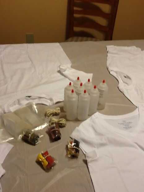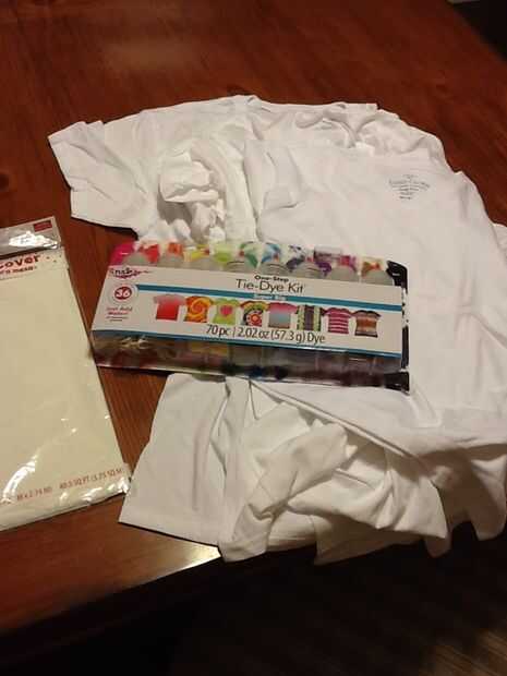 Bastante simple. Obten un kit de tintas de lazo, algunas camisetas (pre lavado), una cubierta de mesa de plástico barato y tal vez algunos rockin tunes para traerle a los días de blanco y muestras de paz. Tienen algunas bolsas de plástico útiles, para almacenar en cuando hayas terminado teñido. Las bolsas de plástico están bien. Utilizamos bolsas de almacenamiento galón tamaño, por lo que cada uno podría escribir su nombre en la una su camisa era pulg. * el kit debe tener botellas, paquetes de color, bandas de goma y guantes.