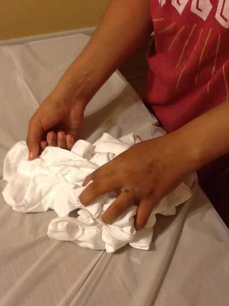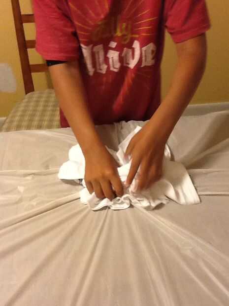 Esta es super facil. Sólo utilizas los dedos a crujir la camisa en la pila un poco. Usted puede envolver un par de goma alrededor de él para mantener unida, o usted puede dejarlo como un montón.