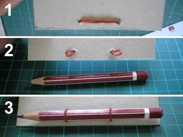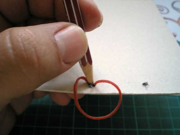 En uno de los trozos de cartón, haz dos agujeros con el lápiz (o unas tijeras). Pasa la goma elástica por ellos tal y como aprecias en las fotos. La goma quedará tapada en el siguiente paso.