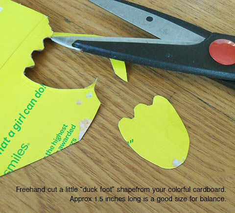 Con unas tijeras, a mano alzada corta una forma de "pie de pato" de la cartulina. Medidas exactas no son importantes, pero lo general diría que una longitud de 1.5 pulgadas es útil para el equilibrio.