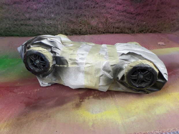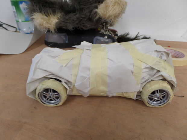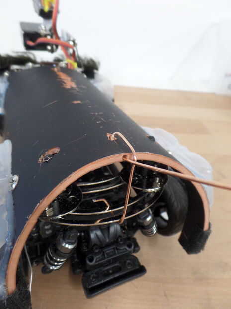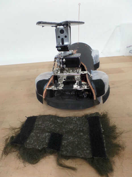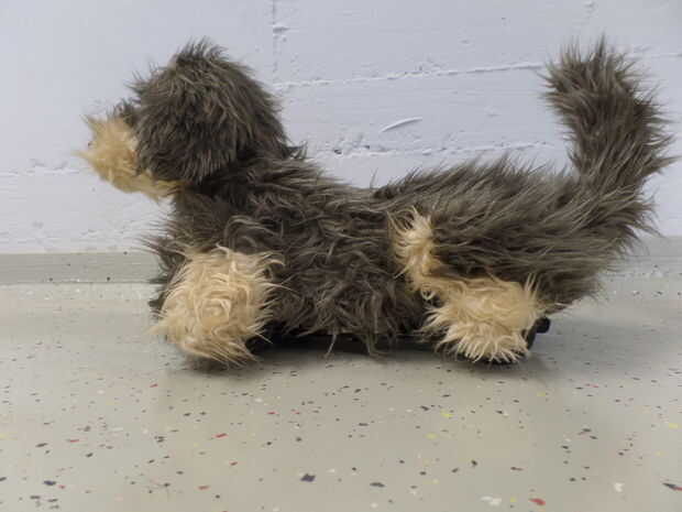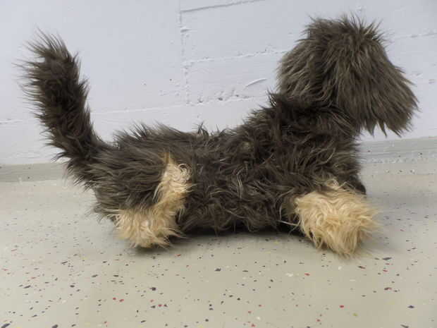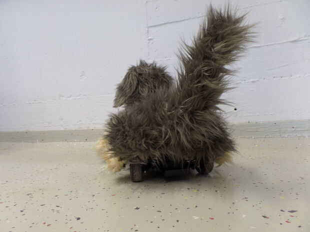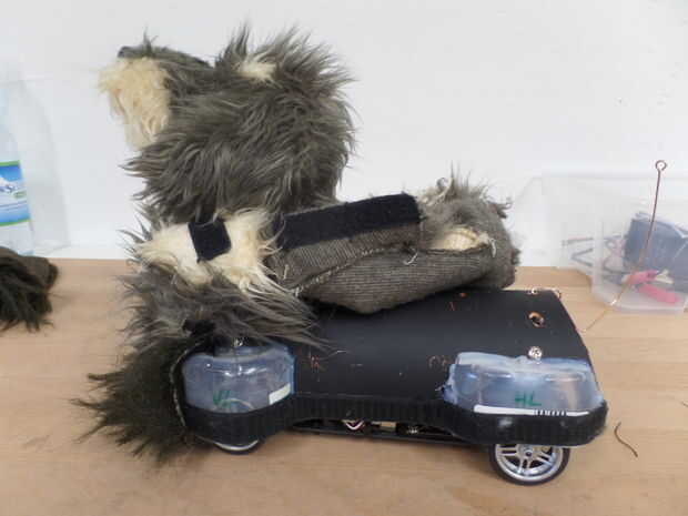 El perro de peluche ya fue tomado aparte y cabe casi en el nuevo cuerpo. Casi, como en: agregar algunos piel extra en la parte delantera. Para fijar la piel para el cuerpo (mano) cosí algunos velcro suave en los bordes de la piel. En los bordes que emparejan del cuerpo que apliqué algunas autas-adhesivo áspero del velcro. Para la cola he añadido algún alambre de soldadura hasta el extremo posterior del cuerpo. Después todo fue montado, aerosol pintado las ruedas para hacerlas desaparecer debajo del perro negro.