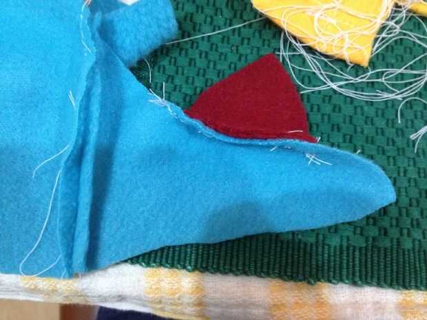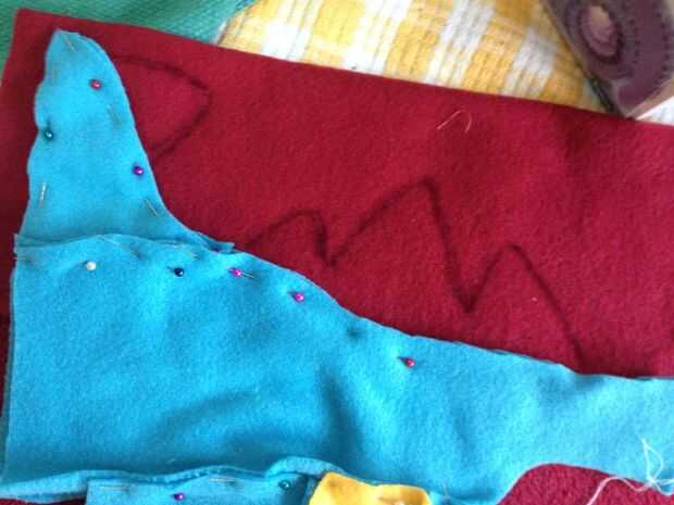 Ahora toma las dos piezas de "back" y pin ellos junto. Tomar a la tela roja y doblar por la mitad. Junte los fijados en la tela roja y en el tamaño y la cantidad de puntos deseados, incluyendo uno para la punta de la historia.