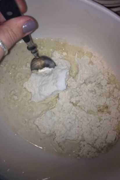 Comience agregando lentamente 1 3/4 tazas de agua harina y sal mezcla. Agregue la harina y la sal mezcla mientras agregas el agua.