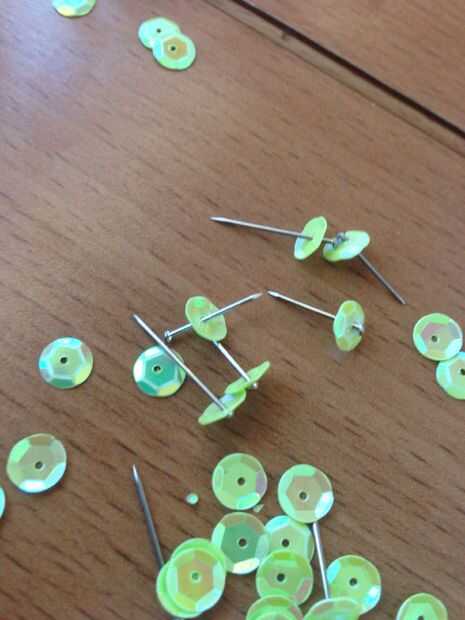 Una vez que usted ha planeado en todos sus colores van a ir, puede empezar a fijar! Para fijarlos, necesitará un pin a través del agujero en el centro de la lentejuela del hilo de rosca. Entonces usted necesita prender en el poliestireno lo más recto y tan limpio como sea posible. Si no es totalmente recta no importa demasiado, pero si haces demasiadas demasiado torcido lo pueden dificultar al pin en todo. Usted necesita tan juntos como sea posible para tratar de ocultar el poliestireno de mostrar a través de los pines.