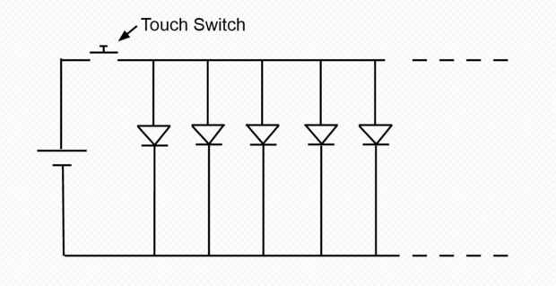 El circuito es muy simple. Cada uno de lo LED cableado en paralelo para que las patas positivas están todos conectadas juntos y todas las patas negativas están conectadas juntos.