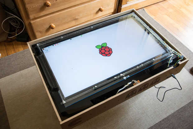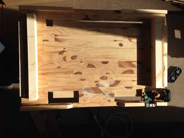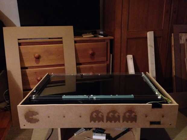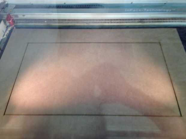 - El cuadro se cierra con un panel de 10mm y un panel de 3mm de MDF con un agujero cuadrado grande el tamaño de la pantalla táctil.