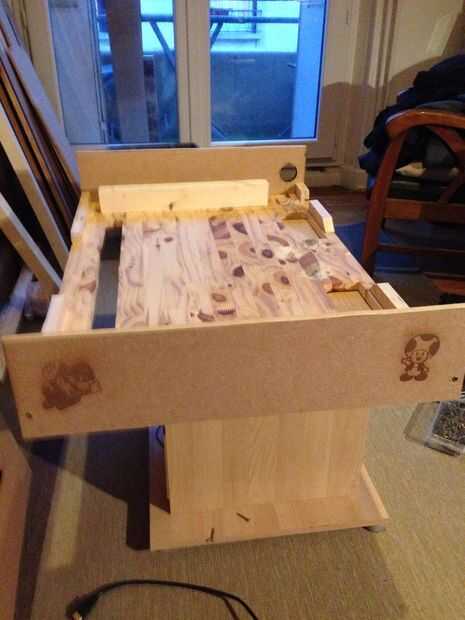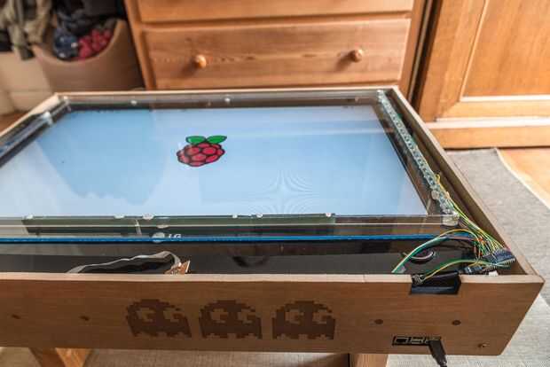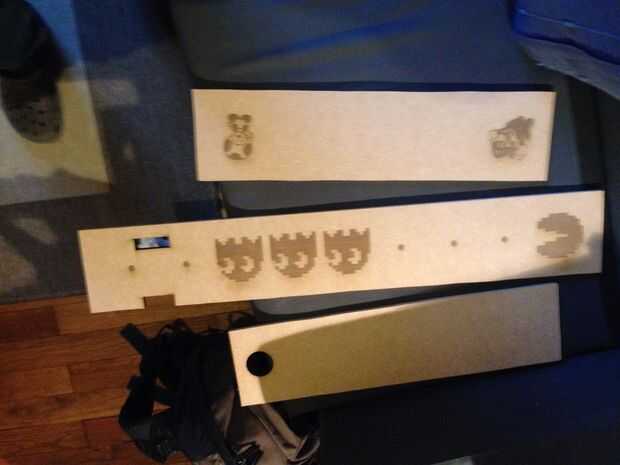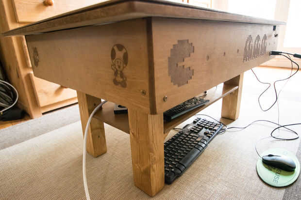 - Algunos láser grabados en los paneles MDF de 10mm alrededor agregar Pacman, Mario, Toad, la apertura para el USB de Raspberry Pi, el ventilador y el agujero infrarrojo del TV.