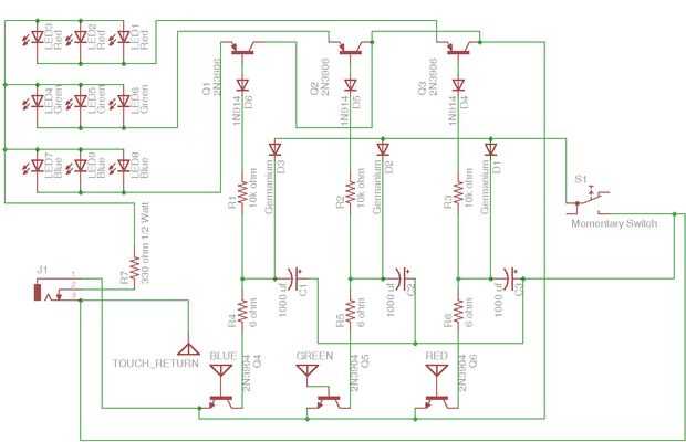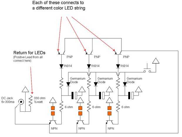 Los LEDs no se muestran en el segundo diagrama porque hay dos configuración puede utilizar. Yo los cableados en paralelo porque creía que la caída de voltaje a través de ellos los haría demasiado tenue. Sin embargo, es su opción para poner en serie o en paralelo. En serie, todos los LEDs va a ser el mismo brillo pero pueden ser algo tenues. En paralelo, debido a pequeñas diferencias en cada LED, pueden ser ligeramente diferentes brillos, pero será más brillante en general luego de la serie. Esto es algo para pensar, el circuito debe trabajar ambas maneras, por lo que es totalmente hasta usted cómo usted alambre su LED.