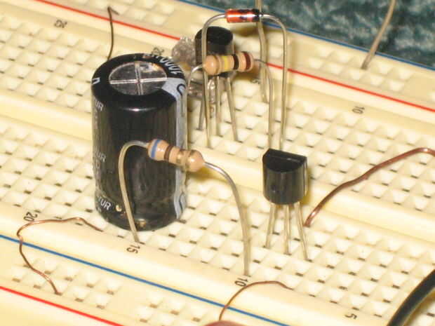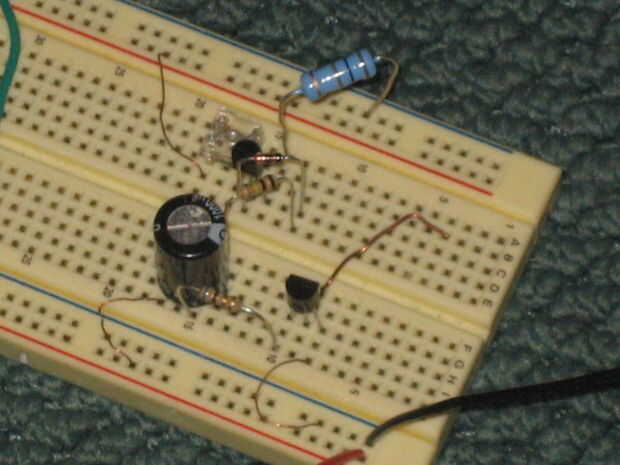 Cuando un dedo se coloca en positivo y uno de los tres, se enciende el transistor NPN correspondiente. Esto permite poder fluir con el resto del circuito. La capacidad de un condensador en serie con una resistencia para aumentar el tiempo que tarda para cargar permite que el LED se enciende lentamente, lo que le permite variar el brillo basado en la longitud de tiempo que dejar el dedo sobre el teclado. Entonces la resistencia muy grande después del condensador disminuye su descarga para que la lámpara no dim inmediatamente. No sé cuánto tiempo permanecerá encendida para, creo que en alguna parte entre 5 minutos y 30 minutos.