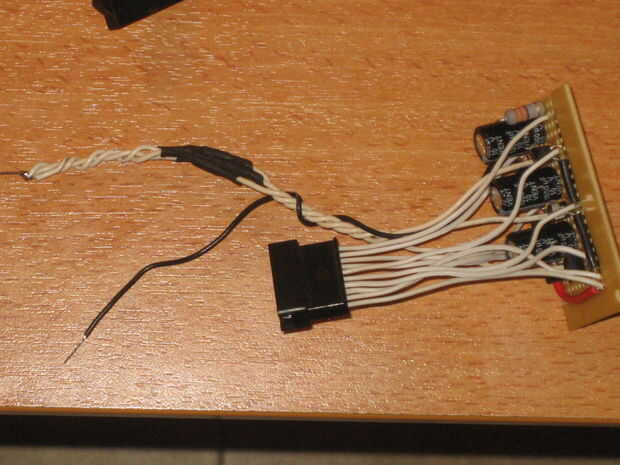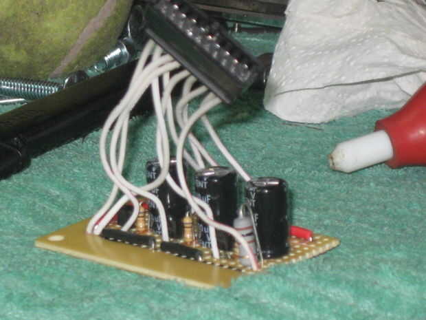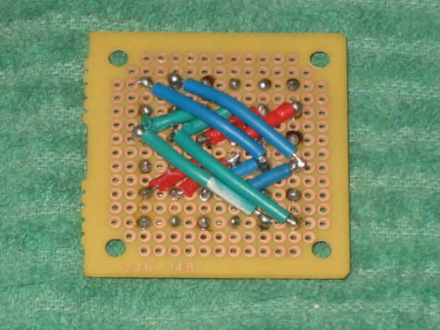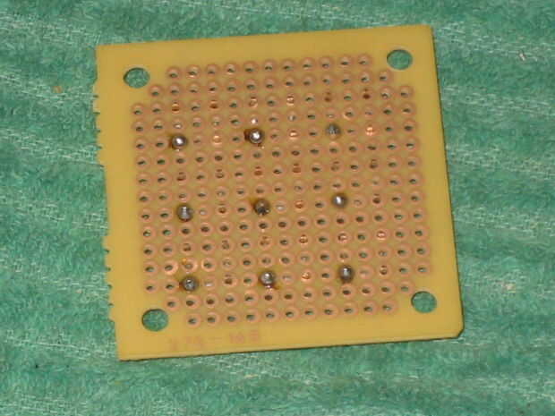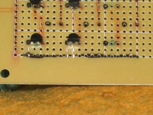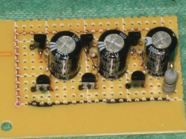Iniciar con los transistores, todos ellos. Cuidado de que dirección van y no te NPNs mezcladas con PNPs. Les de la tachuela. A continuación hacer las resistencias y diodos 1N914. A continuación soldar los puentes positivos y negativos puentes. A continuación soldar los 3 condensadores en. Cuidado de la polaridad del condensador. Finalmente la soldadura de la resistencia de 330 ohmios 1/2 watt y las conexiones de potencia (2, + y -), sensores de tacto (4, R, G, B y positivo), LED (4, R, G, B y vuelta a resistencia de 330 ohm) y para el botón apagado (4, uno de cada cable negativo de los condensadores y el último positivo. Tres de cada condensador necesitan ser cortado por la mitad y añadir el diodo de germanio, cuidado de la polaridad en cada conductor antes de conectar los tres juntos y luego a un lado del interruptor momentáneo. El positivo se conecta al otro lado del interruptor. Si es confuso a la última foto)