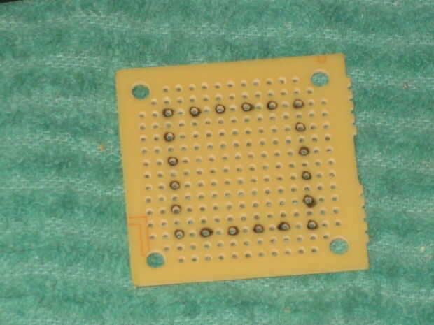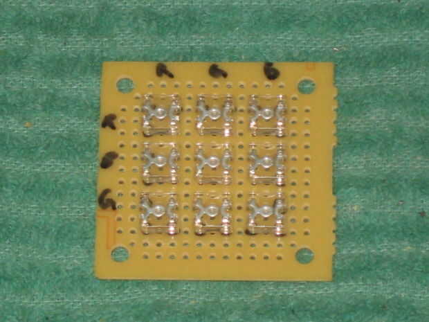 Para los LEDs, averiguar qué configuración funciona mejor. Encontré un agujero de entre todo lo mejor y fue más fácil soldar. Virar una pierna a la vez. Asegúrese de que todos están alineados encima de la misma manera. Esta es la parte más difícil porque la configuración óptima tiene el mismo color LEDs repartidos por todo el tablero. GO LENTO! Código de colores de uso jumpers en la parte inferior.