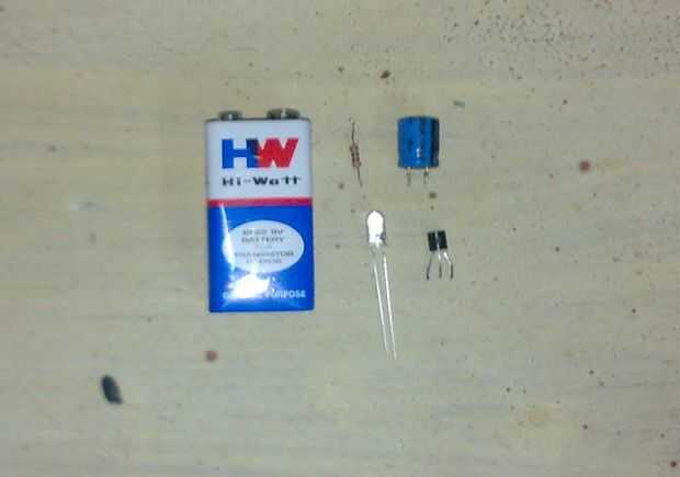 1 x 2N3904 transistores o cualquier otro transistor npn 1 x 470r resistor (amarillo violeta marrón) capacitor de 330uf x 1 1 x LED (3v, cualquier color que usted tiene gusto) 1 x pila de 9V