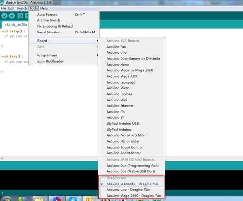 7. una vez corregir Junta y puerto son seleccionados (ahora se puede acceder a Dragino @ 192.168.1 <--IP debe estar en herramientas / desplegable puerto) en este punto probablemente puede subir un dibujo simple como blink para usted puede comunicarse con la placa.