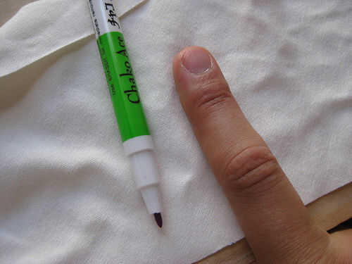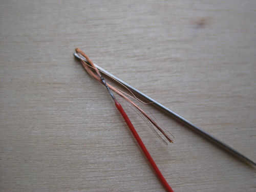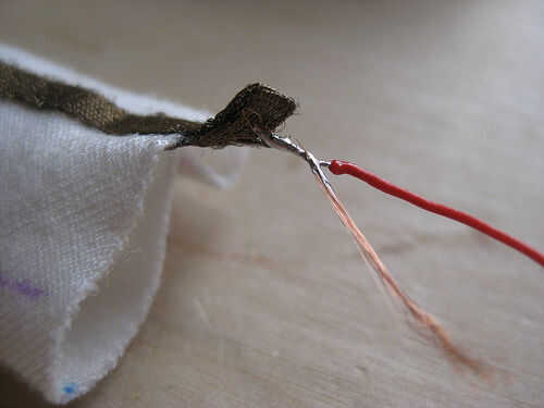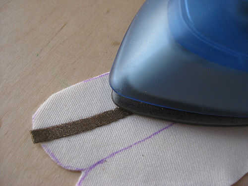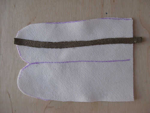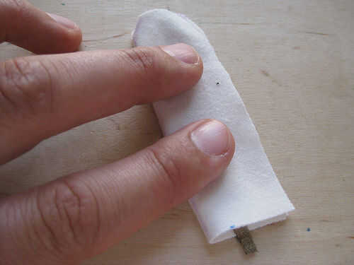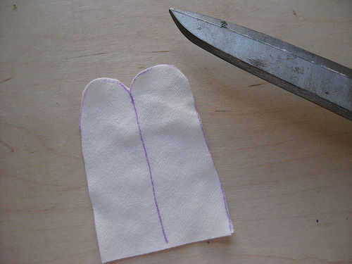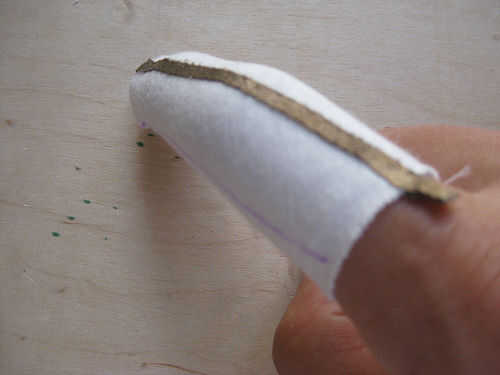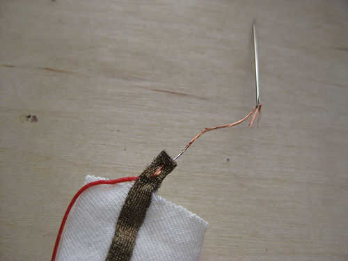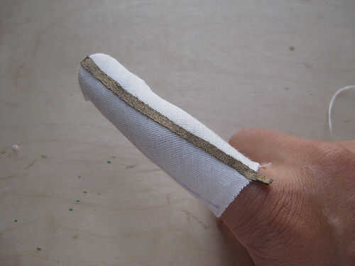 Rastro de ambos lados del dedo índice en un pedazo de tela de estiramiento y añadir un poco de la costura y corte. Hierro-en (fusible) una tira de tejido conductor elástico a lo largo de la longitud del centro de un lado. Doblar por la mitad (derecho lados juntos, conductor tira dentro) y coser alrededor de los bordes. Vuelva al reves y colocar un cable a las conductoras de la tira en el extremo abierto de la tapa del dedo.