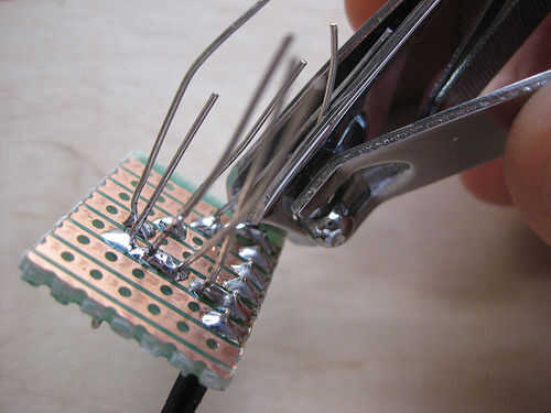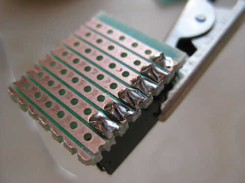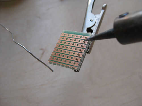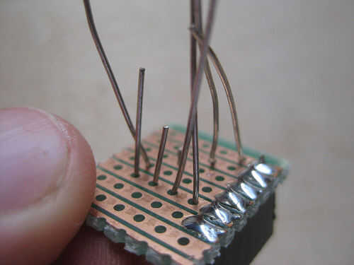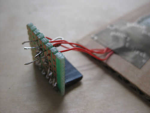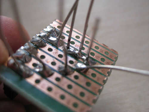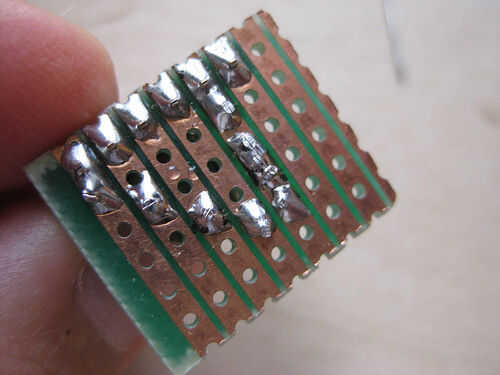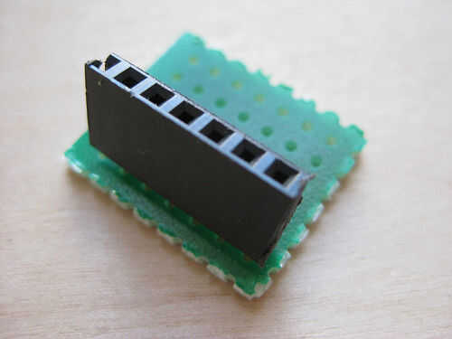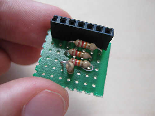 Cortar un agujero de 6 x 7 perfboard (líneas cobre menor, 6 agujeros, longitud). Cortar una fila de encabezados de mujer 7 y soldarlos a la primera fila de 7 agujeros. Resistencias de 20K entre el tercer orificio y cada uno de los 4 agujeros al lado de la soldadura. También ver las fotos para la instrucción.