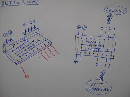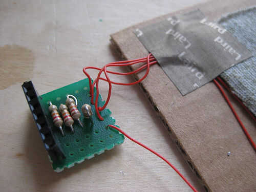 Cortar un agujero de 6 x 9 perfboard (líneas cobre menor, 6 agujeros, longitud). Cortar una fila de 4 cabezales macho y soldarlos a los primeros cuatro hoyos en la fila de 9 hoyos. Corte 2 cabezales macho y soldarlos a los dos últimos orificios en la misma fila de 9 hoyos. Soldadura de resistencias de 20K entre cada una de las 4 cabeceras de macho y el más cercano de las dos cabeceras masculinas - estos fósforo para arriba con la placa Arduino. Los extremos de los cables (rojo) cuatro procedentes de los rincones de su touchpad punto al otro extremo de la perfboard para que cada entrada se encuentra con una resistencia de la soldadura. Suelde el cable (rojo) que forma la tapa del dedo hacia la izquierda sobre el cabecero en la esquina. Ahora esto debe encajar directamente encima de tu Arduino y debe ser capaces de conectar las cabeceras hombres sobresale su perfboard en las primeras 4 entradas analógicas y dos cabezales deben insertar en el GND y + 5V. Ver sketch!