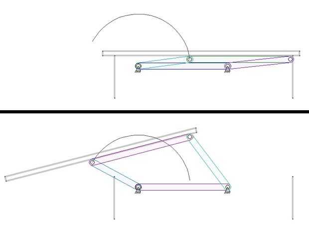 Yo ya había pensado en una idea de cómo funcionaría el escritorio en mi cabeza pero para probar la teoría, usaba un programa libre, no comercial para el diseño en principio el mecanismo de elevación/inclinación, llamado acoplamiento. Vinculación, para citar el manual ".. .es un programa de ordenador que te permite diseñar y editar dos mecanismo dimensional y luego simular el movimiento de ese mecanismo". Puedes ver mi prueba de resultados de concepto de la imagen.