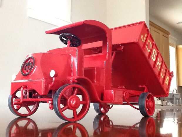La foto muestra un camión de juguete que hice para mi nieto. Es un facsímil de un Bulldog de Mack AC descarga truck.* no es una réplica exacta a escala de 1920. Está hecha de chatarra de acero que he recogido, incluyendo la piel externa de una vieja lavadora. El camión de juguete es de 14 pulgadas de largo.