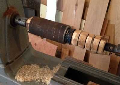 Estoy cortando anillos del tubo para hacer los bordes de la rueda. Montado el tubo en una longitud de 2 x 2 pulgadas de madera de pino, que soy capaz de montar en un torno de madera. Entonces usé una cabeza amoladora con un disco de corte para separar los anillos del resto de la tubería.