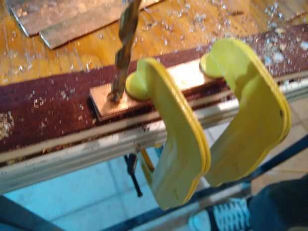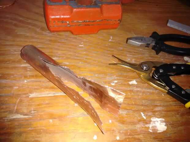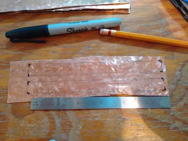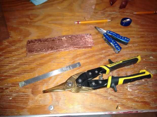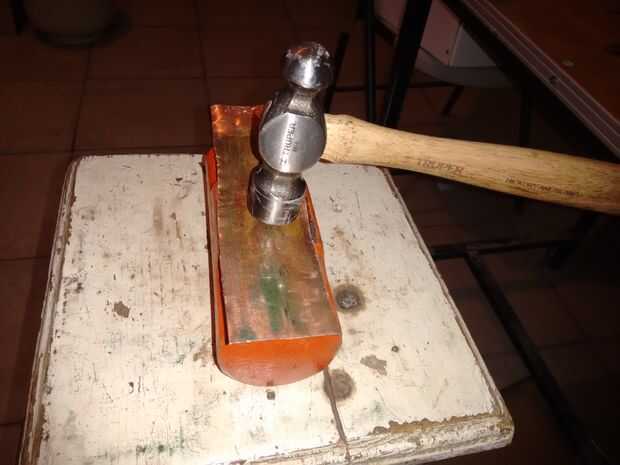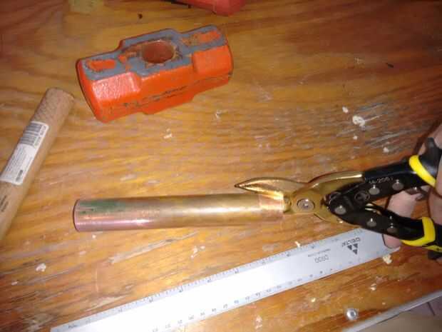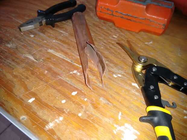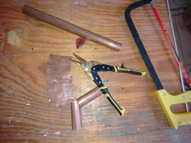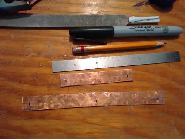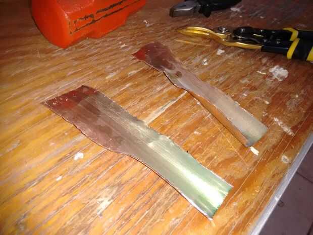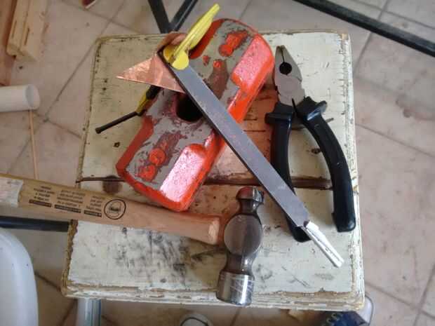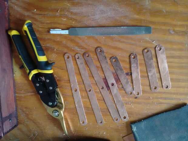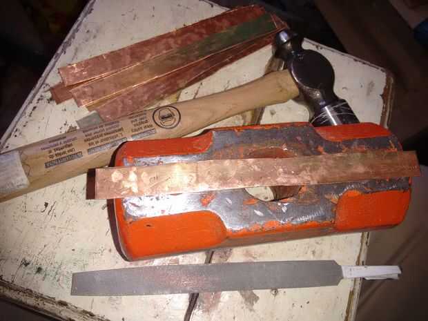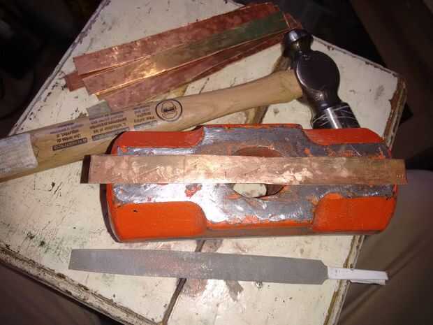 Algunos de lo hardware personalizado de este proyecto está hecho de tubo de cobre, era cortar una sección de cobre, luego cortar por la mitad longitudinalmente con un par de tijeras de metal y luego aplanado en un yunque con un martillo de ballpeen, es un divertido proceso porque el resultado es impresionante con piezas únicas de hardware.