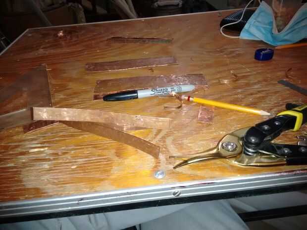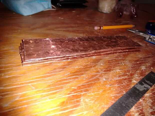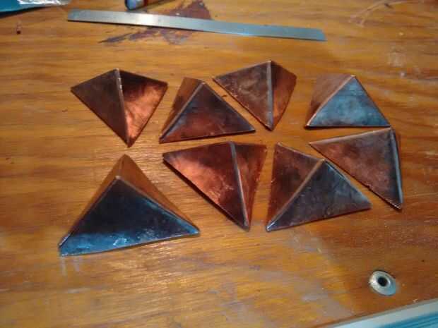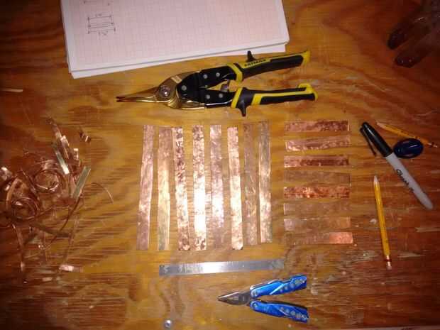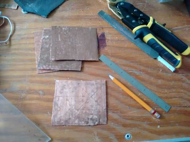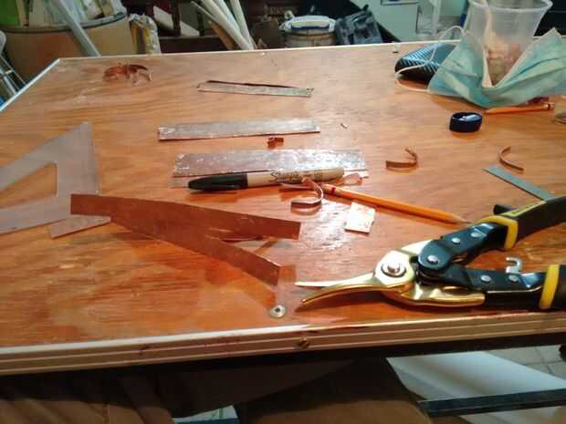 Para el cuadro de las esquinas lo tiene 4 secciones de tubo de cobre de 3'' de longitud, con la diferencia que esta vez que el cobre no es splited por la mitad, además de un corte longitudinal para obtener una sola plana de cobre de la placa que de usted puede conseguir 2 esquinas por placa.