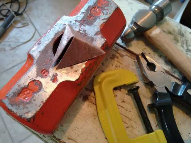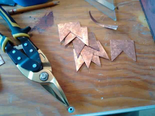 Dibujar el patrón de diseño áspero en la placa de cobre que es una forma del triángulo básico, luego córtela con las tijeras de metal, una vez que tengas la forma plana, curva utilizando una superficie plana dura, por ejemplo utilicé un archivo a la forma y un martillo ballpeen para alcanzar la curva.