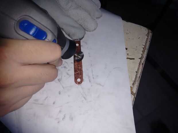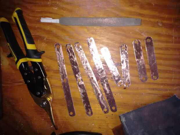 Una vez que las placas planas 6, la forma básica del diseño de enlace fueron dibujados sobre el cobre y luego cada sección se cortó con las tijeras de metal, luego los agujeros fueron perforados para finalmente cantos con una lima y pulidos con un poco de dremel wirebrush.