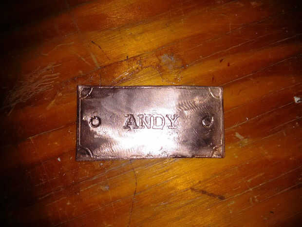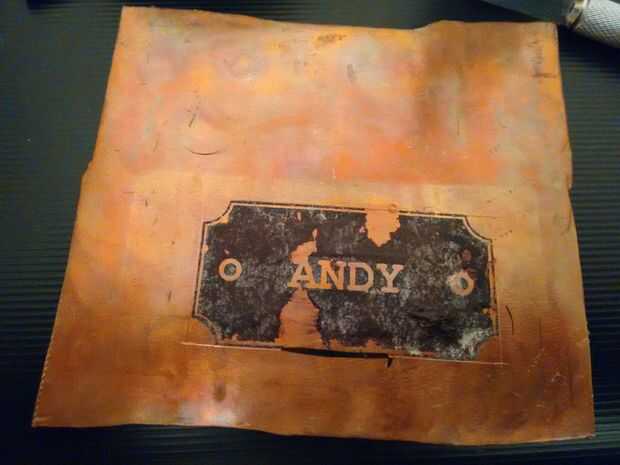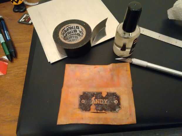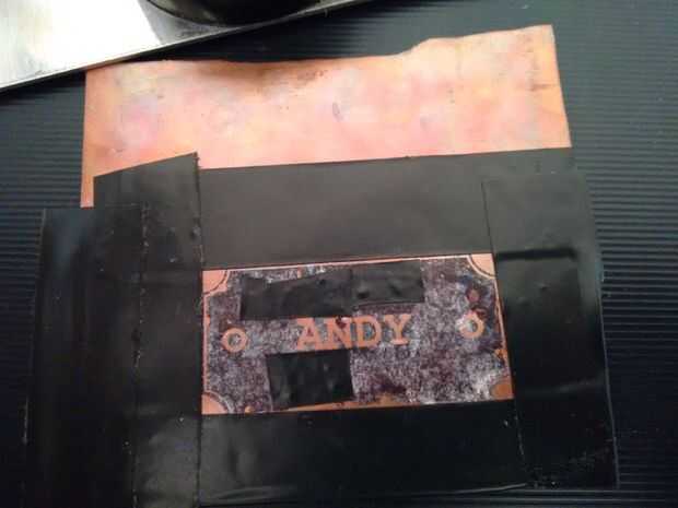 Como un toque personal, el diseño toolchest incluye una placa con mi nombre grabado en ella, fue hecho con una hoja de cobre sobrante y comenzó a usar un editor de texto PC y hacer un diseño en negativo y texto espejo, entonces el diseño fue impreso en papel de revista (debe ser una impresora de tóner), a continuación el diseño fue ajustado y transferido con calor (con una plancha de ropa) para alrededor de media hora , después de enfriar la placa de cobre, el papel se quita la placa revela el toner transferido de lavado.