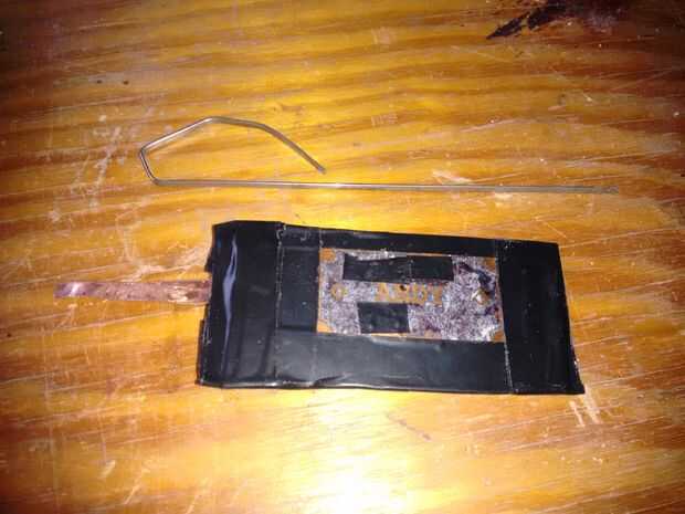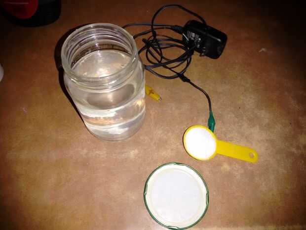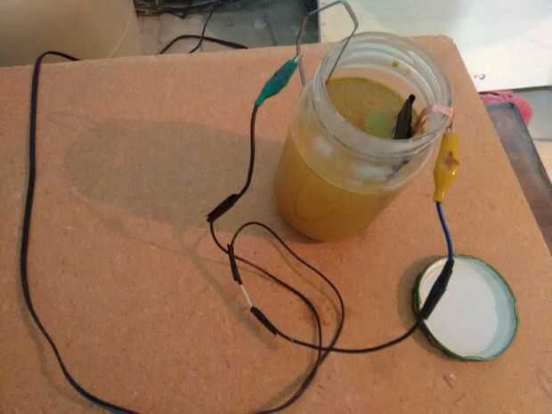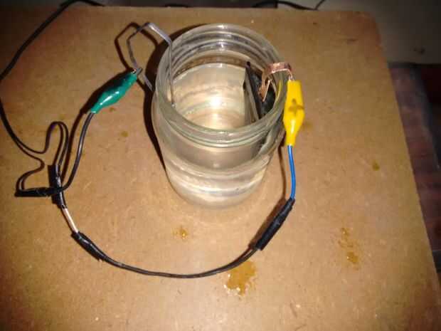 Llene un frasco de salmuera con agua y añadir 10% de sal, sumerja la hoja de cobre en salmuera (sólo las áreas aisladas y diseño, debe ser fuera del agua la sección de cobre que actúa como una terminal) y sumergir un alambre de acero en el otro lado de la jarra.