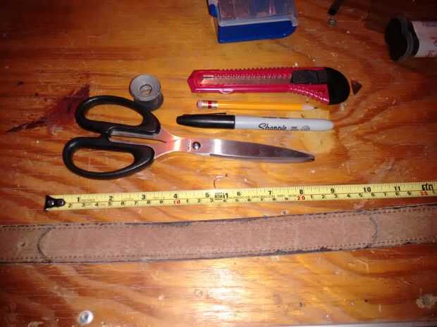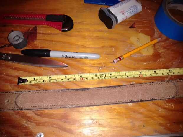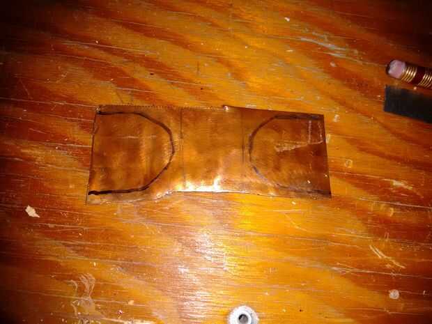 Primero fue medido en la correa vieja el tamaño de la manija (8'') y la holgura de la correa (total de 10'', 2'' flojo), a continuación, fue marcado y formado con los extremos circulares, luego fue cortado con tijeras y luego transferido a la forma de ambos extremos a la pieza de cobre.