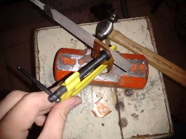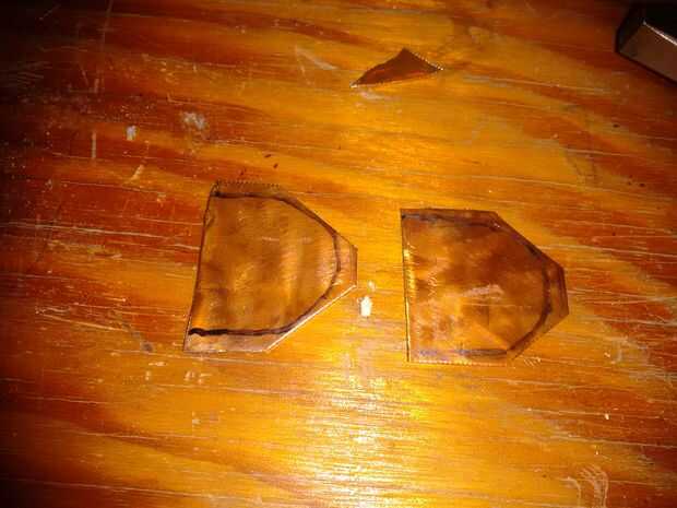 La pieza de cobre se cortó con unas tijeras de metal con un desplazamiento de la transferencia original de la correa de cuero, luego fueron dos orificios en cada extremo para 3/16 '' tornillos tanto cuero correa y el pedazo de cobre. Con una superficie recta dura y un ballpeen martillo doble pieza de cobre en offset para hacer un par de guardias bonito mango de cobre. :)